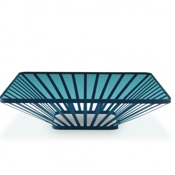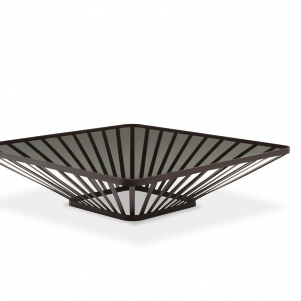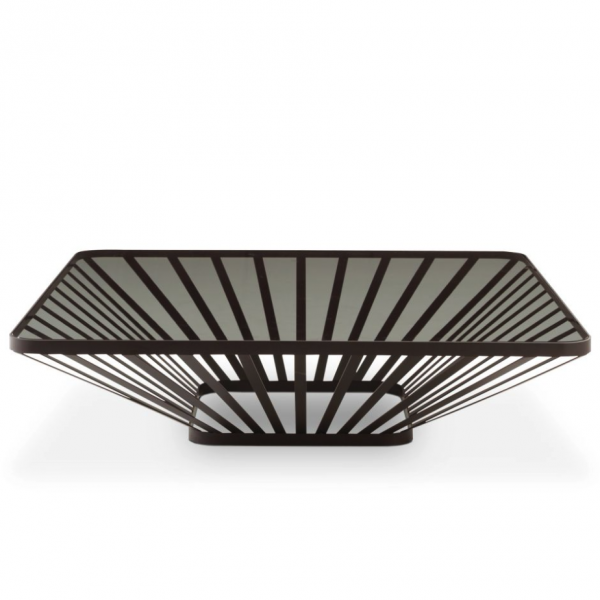 有三种尺寸可供选择:大的鸡尾酒桌,端桌和小的临时桌,都是三个方形的。有彩色玻璃(蓝色)或灰色或青铜烟熏玻璃。基材:金属钢的材质;玻璃桌面